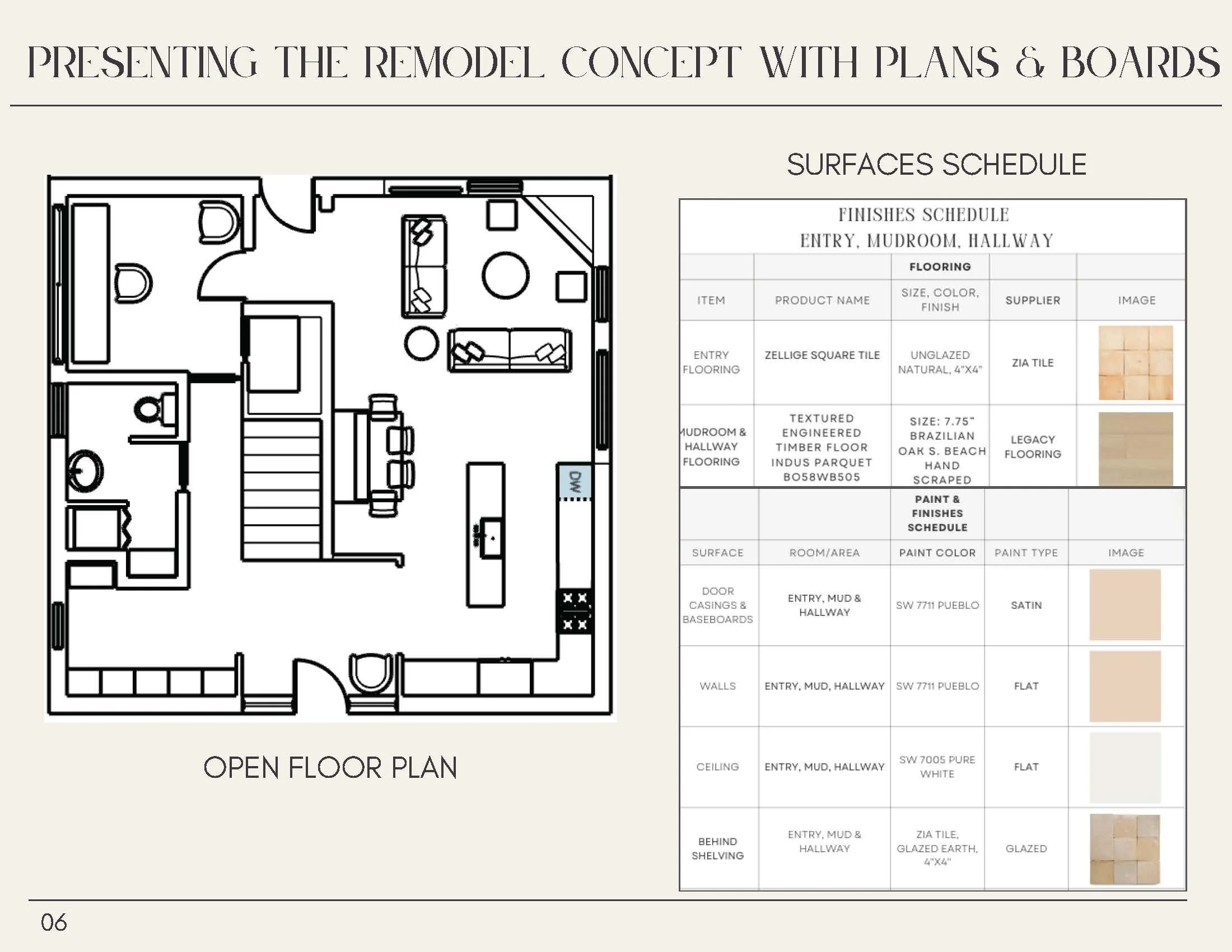 scheme and selections to be used in the final design. It will show the actual colors, materials, finishes and furniture to give you a true indication of how the finished space will look.